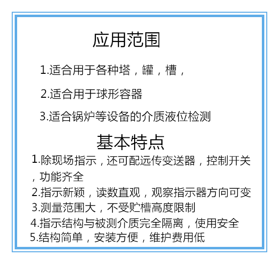 2、被測介質(zhì)與指示結(jié)構(gòu)完全隔離,密封性能好,防泄露、適應(yīng)高壓、 高溫、腐蝕條件下的液位測量,可靠性高。